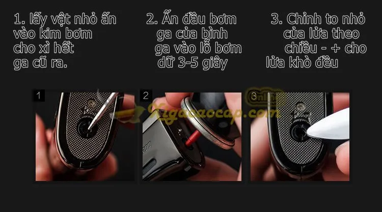 Mẹo nhỏ: Nếu sau khi bơm mà bật lửa vẫn không cháy, hãy thử xả bớt một chút hơi ra ngoài, có thể do bạn đã bơm quá đầy khiến áp suất quá cao, gas không thoát ra dạng khí được.