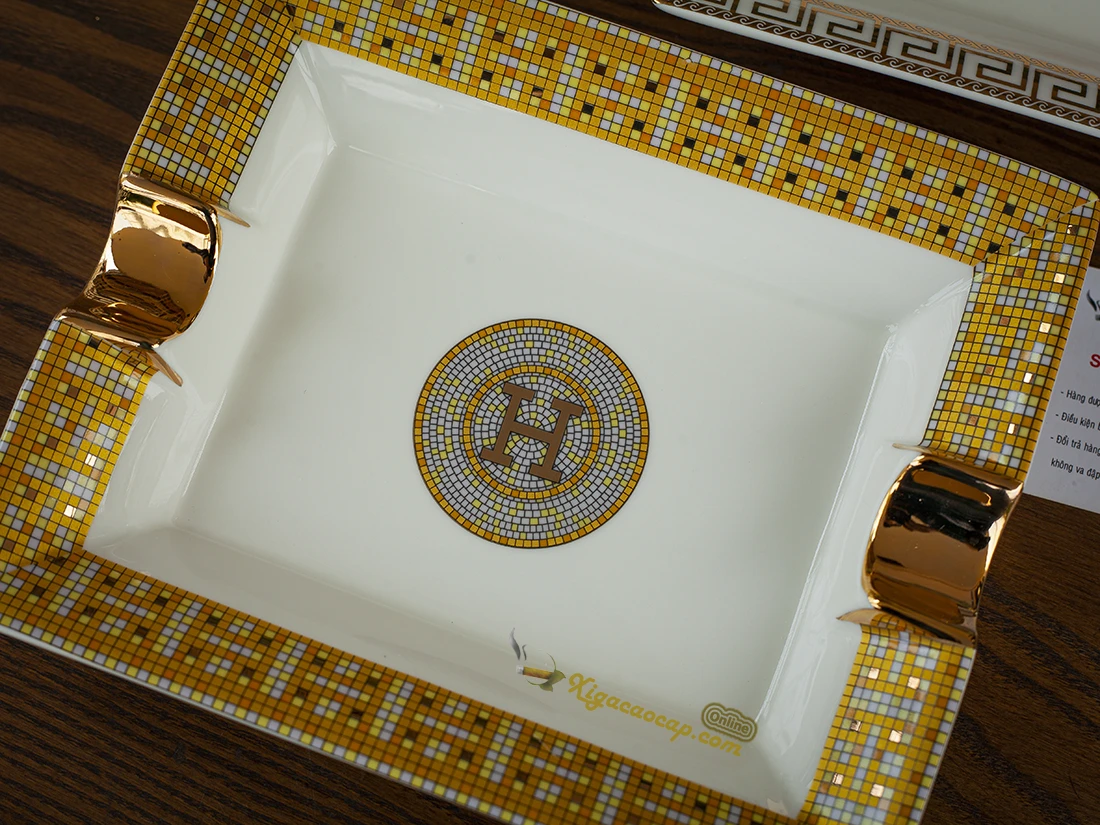 Ở trung tâm là biểu tượng chữ H trong vòng tròn mosaic, lấy cảm hứng từ thương hiệu Hermès. Thiết kế hình chữ nhật với hai rãnh đặt điếu giúp người hút có thể đặt xì gà dễ dàng khi nghỉ.