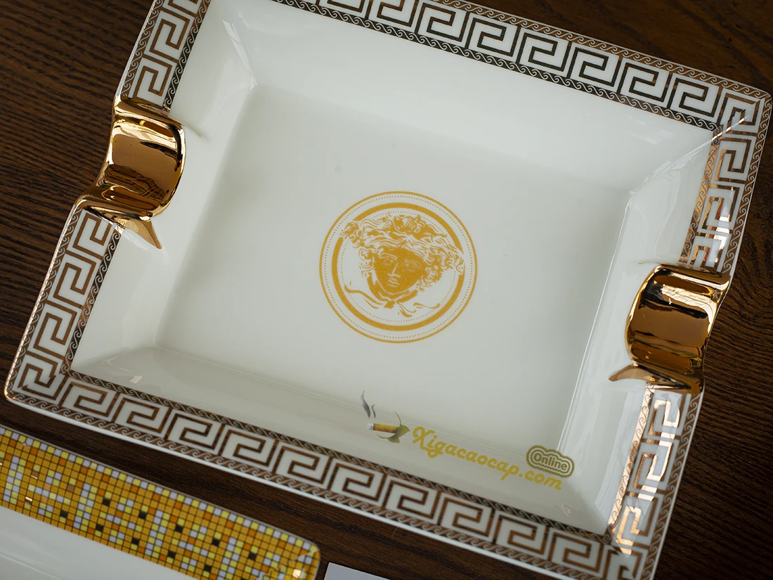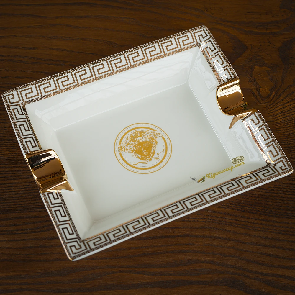 Gạt tàn xì gà gốm sứ với họa tiết Medusa và viền hoa văn Hy Lạp mang phong cách phương Tây cổ điển.