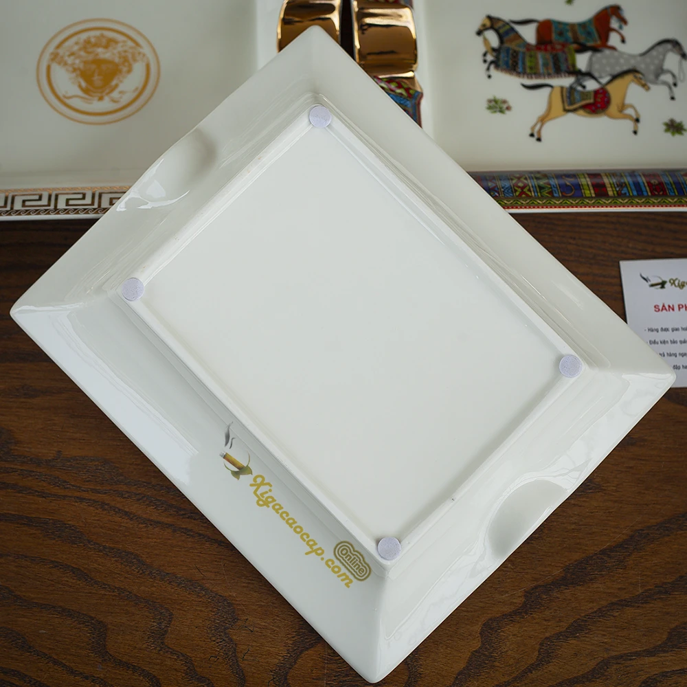 Thân gạt tàn được làm từ gốm sứ cao cấp, bề mặt phủ men bóng mịn giúp dễ dàng lau sạch tro và tàn xì gà sau khi sử dụng. Phần viền được trang trí bằng họa tiết Greek Key (hoa văn Hy Lạp) – biểu tượng quen thuộc trong kiến trúc và trang trí châu Âu cổ điển.