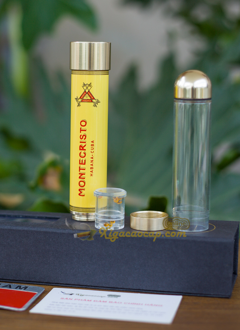 Ống đựng được làm từ kim loại cao cấp kết hợp lớp sơn bóng mượt màu vàng sang trọng, có in logo Montecristo